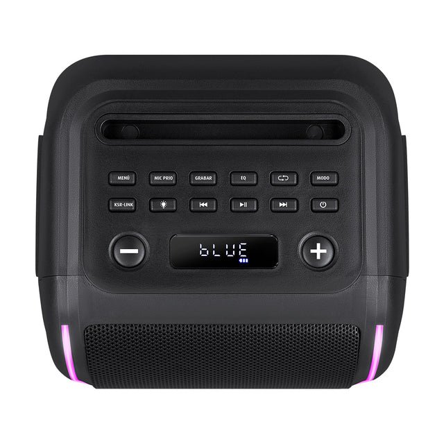 Vive cada ritmo con 30W RMS de sonido nítido y envolvente. Conecta fácilmente porBluetooth® 5.4 o enlaza otro bafle con tecnología KSR-LINK 9.2< para duplicar la energía. Disfruta de luces LED con modos dinámicos, radio FM, y una pantalla con controles intuitivos volumen, graves, agudos y eco de micrófono, o graba tu audio con facilidad.